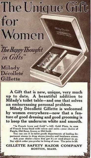 Gillette introduced Milady Décolletée razors in 1915, prettily boxed for the fashion conscious: changed the world as we know it. How much have you spent on hair removal in your lifetime? Remember we think of it as a need but it STARTED as a want and advertisements as well the view of women by the world made it a need.